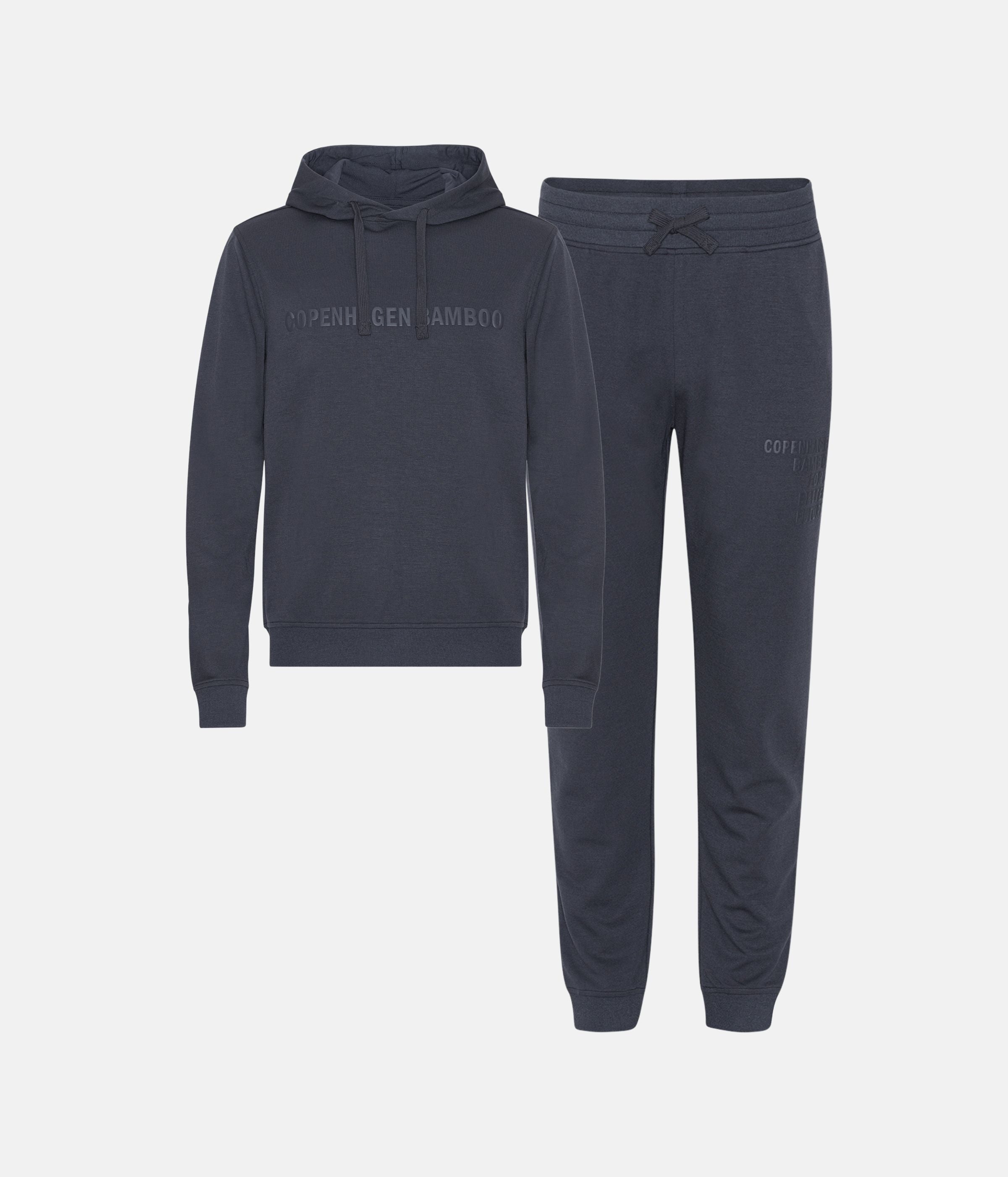 Dunkelgraues Joggingset bestehend aus Jogginghose und Kapuzenpulli. Beide Teile sind aus Bambus-Viskose, Bio-Baumwolle und Polyester hergestellt. Die Jogginghose hat Reißverschlüsse an den Taschen, damit Geldbörse und Schlüssel nicht herausfallen.